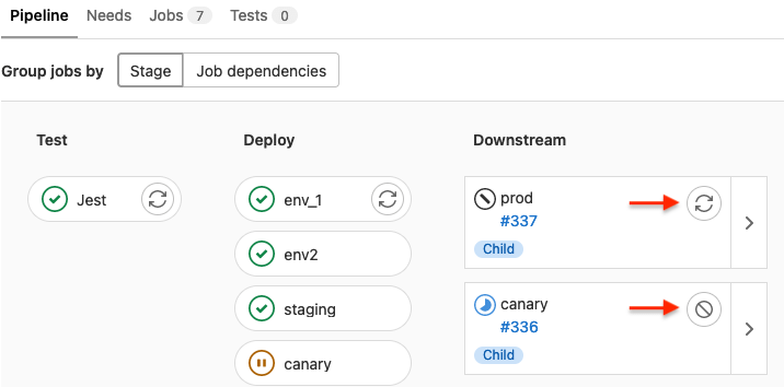 To cancel a downstream pipeline that is still running, select Cancel ({cancel}) on the pipeline's card.