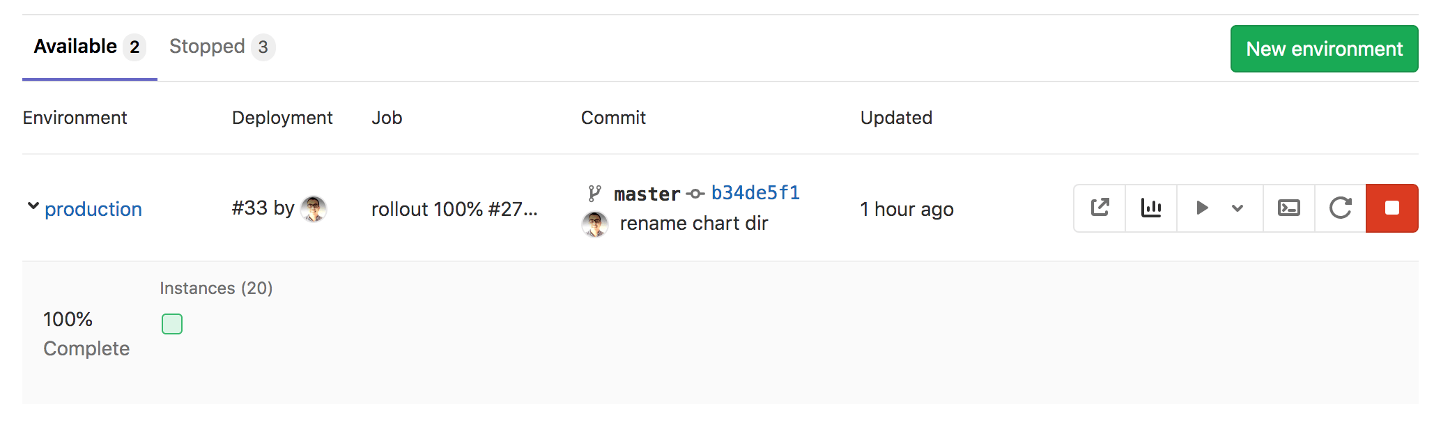 GitLab displays the deploy board below the environment's information, with squares representing pods in your Kubernetes cluster, color-coded to show their status. Hovering over a square on the deploy board displays the state of the deployment, and selecting the square takes you to the pod's logs page.