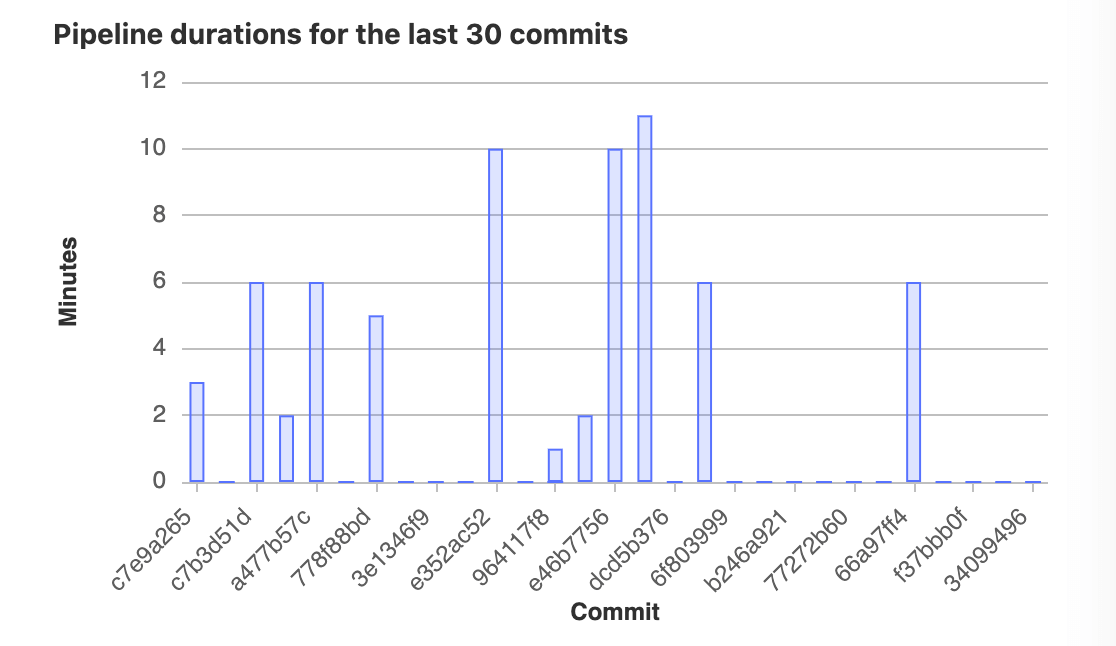 The lead time for changes chart shows information about how long it takes for merge requests to be deployed to a production environment. This chart is available for groups and projects.