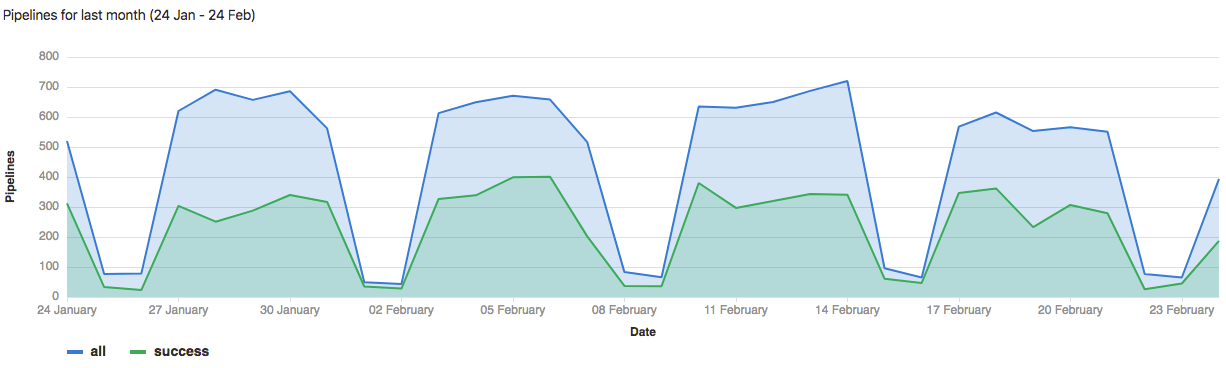 Pipeline statistics are gathered by collecting all available pipelines for the project, regardless of status. The data available for each individual day is based on when the pipeline was created.