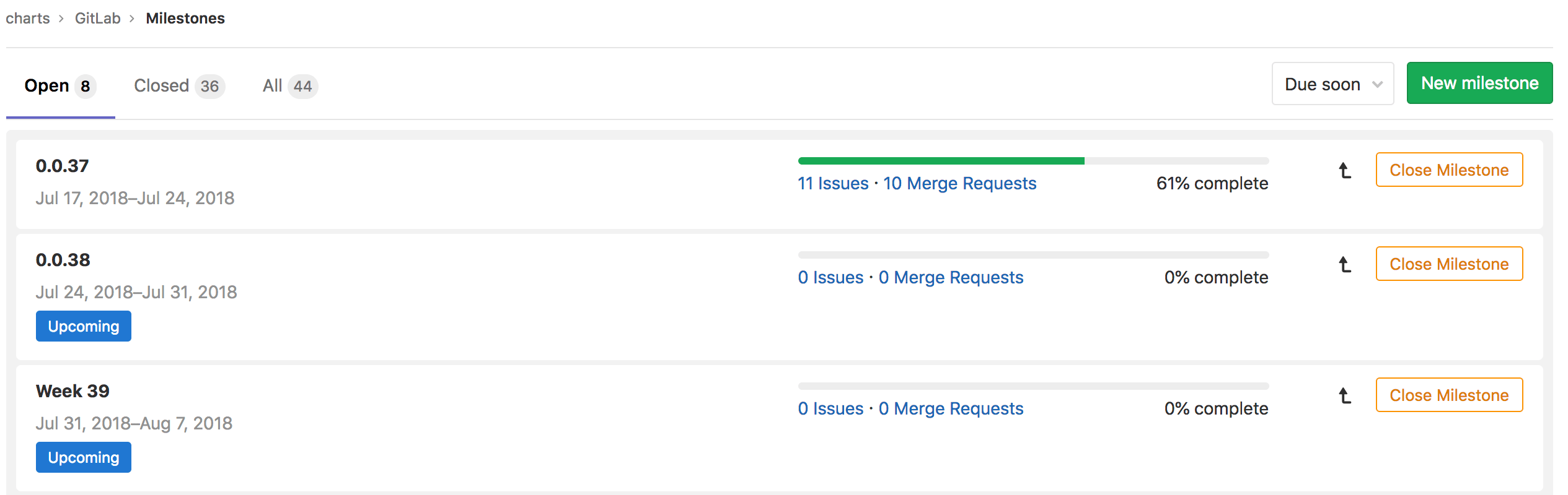 - Upcoming: Show issues or merge requests that have been assigned the open milestone and has the nearest due date in the future.